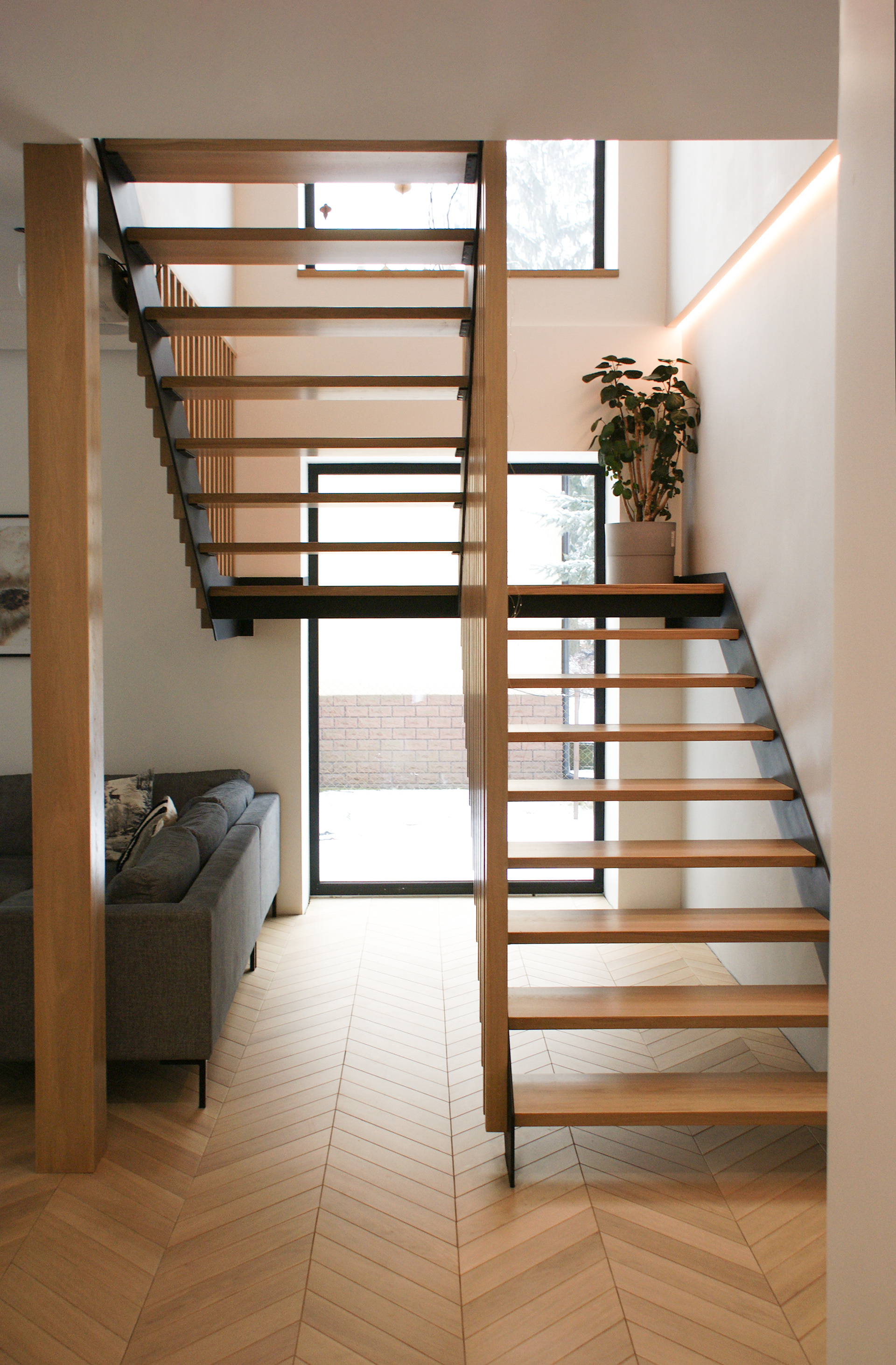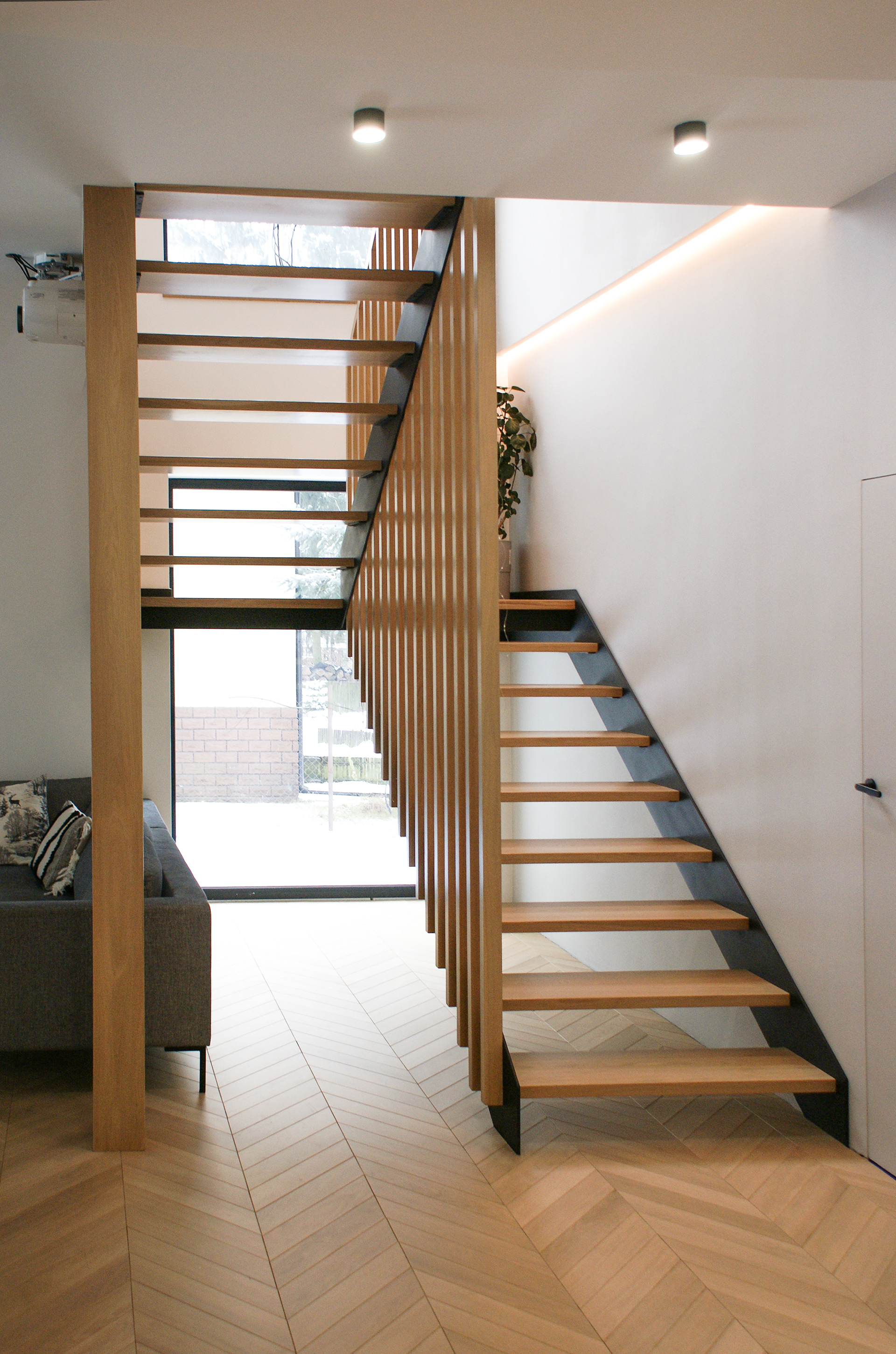 Nowoczesne schody dwubiegowe ze stopniami z drewna dębowego i stalowymi belkami bocznymi. Dzięki zastosowaniu stali belki są wyjątkowo cienkie więc nie przytłaczają wnętrza, jednocześnie nadając loftowy charakter.