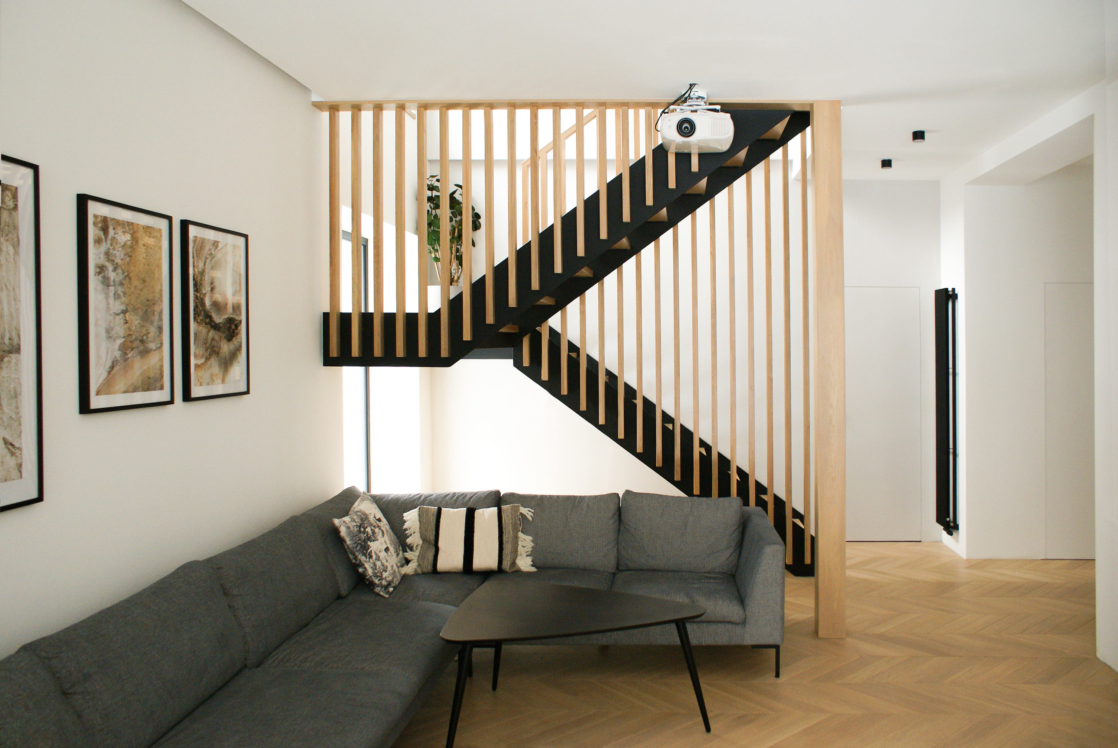 Balustrada z lameli drewnianych tworzy przepierzenie, które oddziela wizualnie salon od tzw. komunikacji. Jest to prosty i nowoczesny zabieg, który nadaje klatce schodowej określoną bryłę.