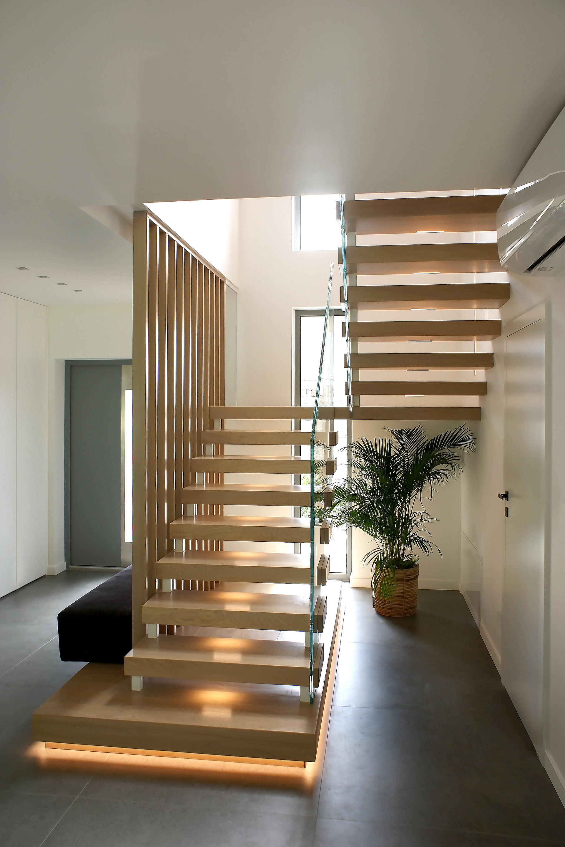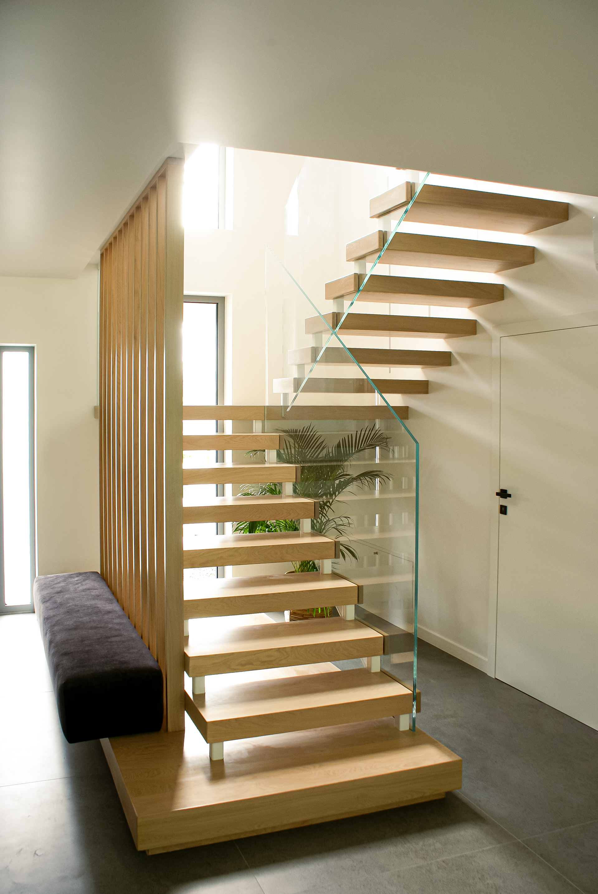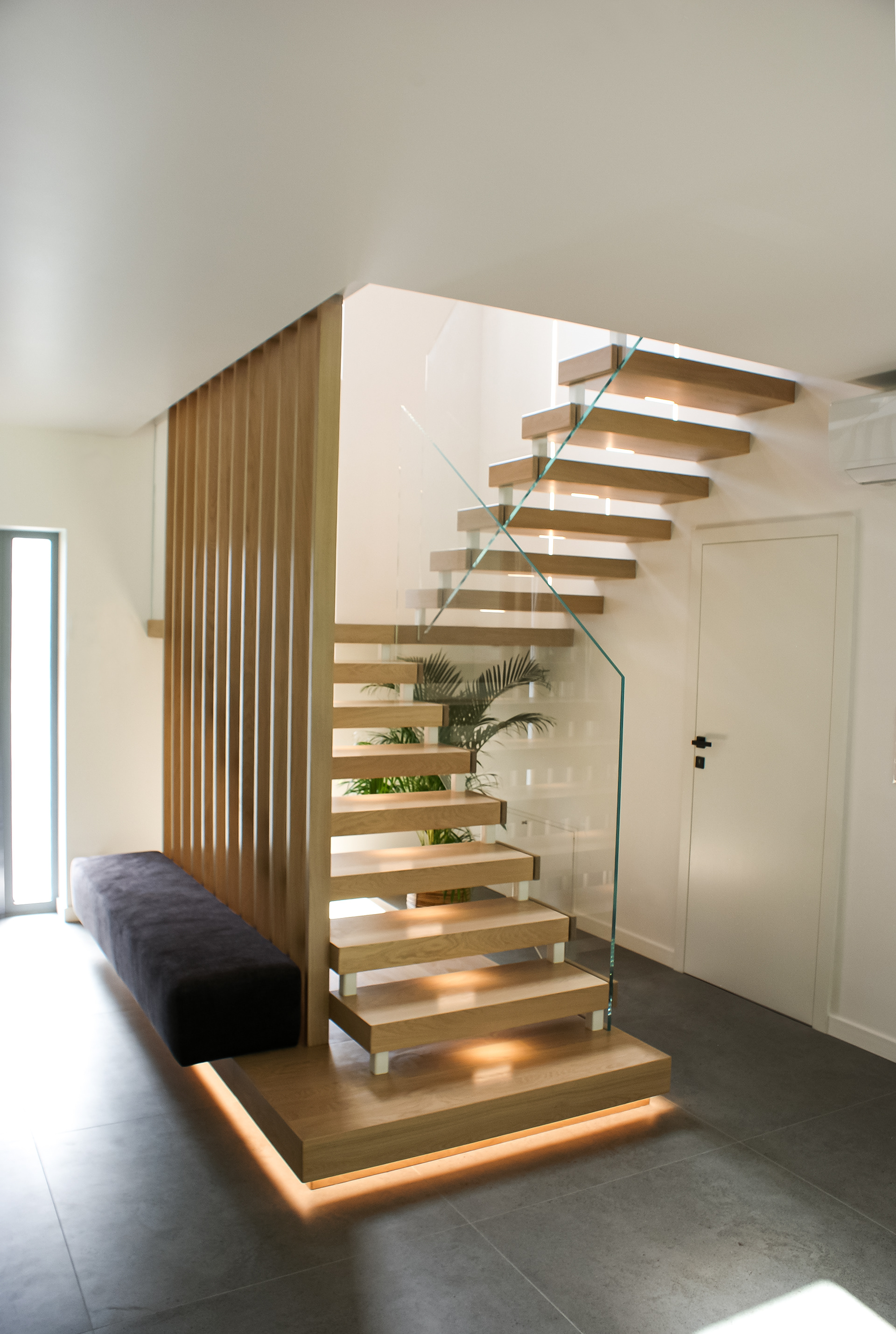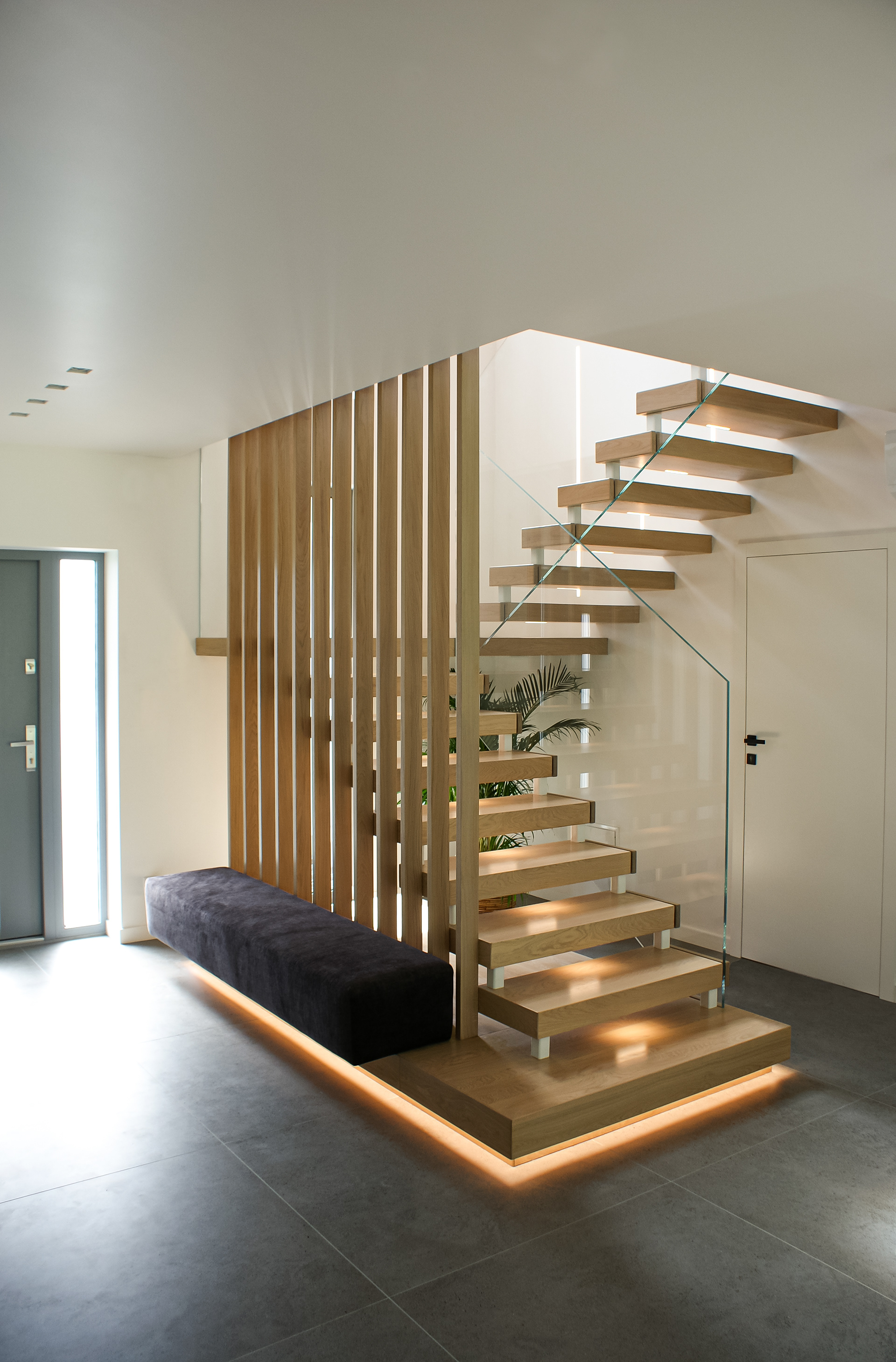 Otwarta klatka schodowa została oddzielona wizualnie poprzez estetyczne lamele drewniane. Integralnym elementem projektu jest również tapicerowane siedzisko, zamocowane wzdłuż lameli, będące bardzo praktycznym elementem w przedpokoju. To połączenie drewna, szkła oraz miękkiej tapicerki doskonale wpisuje się w stylistykę nowoczesnych wnętrz premium.